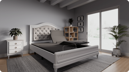 An adjustable bed base is designed with adjustable hinges that enable you to raise and lower your head, feet, or both by way of a remote control.
